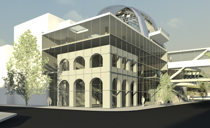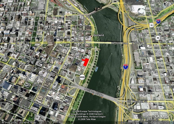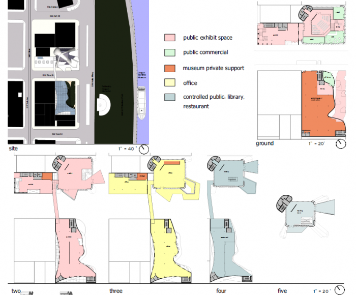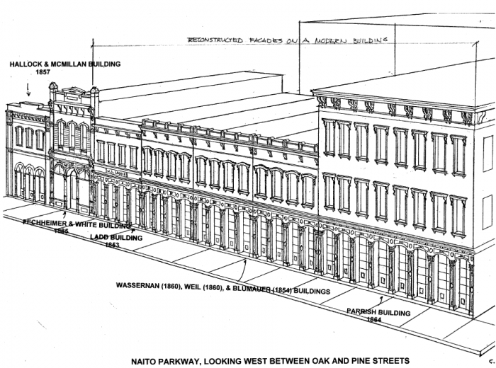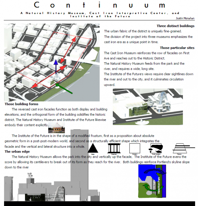 Portland's remaining cast-iron facade pieces mounted inside-out in a glass box. Academic studio proposal 2008. Standing on SW First Ave looking northeast.